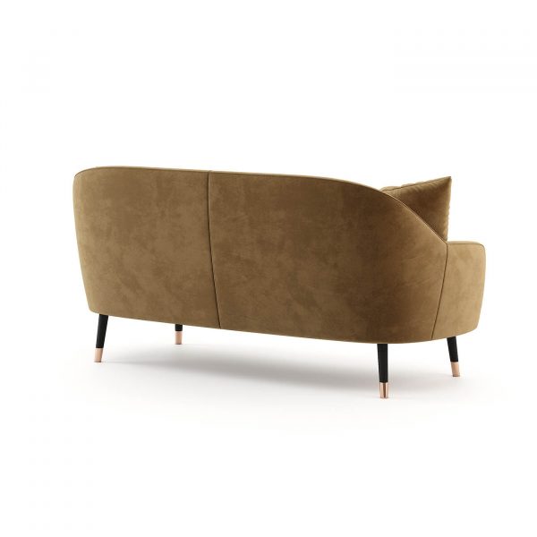 Sofá elegante de 3 lugares estofado, com pernas de madeira com apontamento metálico. Um toque feminino e elegante para a decoração da sua sala de estar.